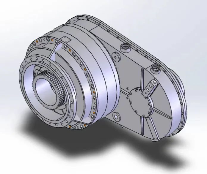 該產品是為某科研單位研發的大功率大速比NW型高速行星齒輪箱,齒輪箱額定功率8000kW,額定輸入轉速4000r/min,單級減速比20,齒輪線速度45m/s。該齒輪箱為我司自主開發的首臺NW型行星齒輪箱,解決了NW型行星機構配齒設計、均載機構設計、行星輪滑動軸承設計、薄壁氮化內齒圈制造、雙聯行星輪加工制造等關鍵技術,為我司大功率大速比高速行星齒輪箱的開發奠定了基礎。